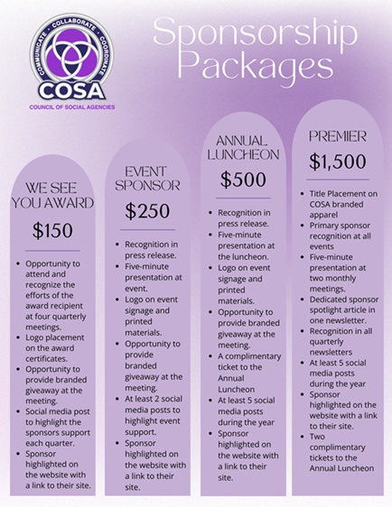 This sponsorship celebrates the unsung heroes of our community. Sponsors help shine a light on those making a difference and receive visibility among COSA’s network of nonprofit leaders and community advocates. A COSA member that has provided outstanding commitment to making the community better receives a framed certificate, a pair of purple sunglasses, and a gift card.