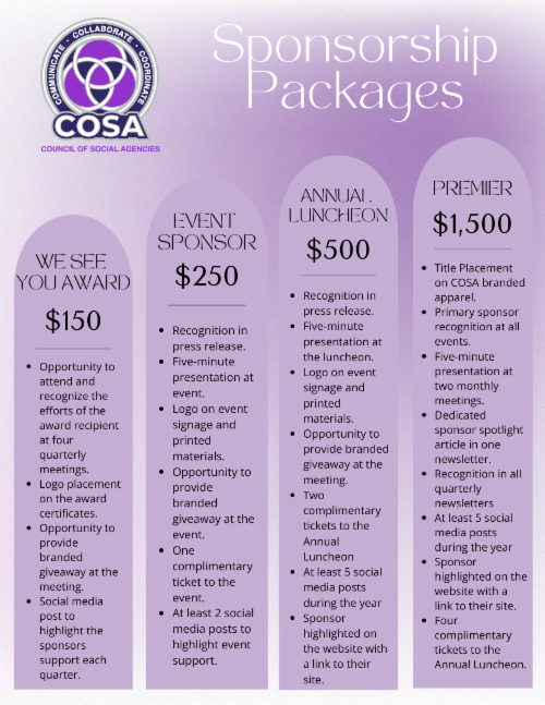 This sponsorship celebrates the unsung heroes of our community. Sponsors help shine a light on those making a difference and receive visibility among COSA’s network of nonprofit leaders and community advocates. A COSA member that has provided outstanding commitment to making the community better receives a framed certificate, a pair of purple sunglasses, and a gift card.