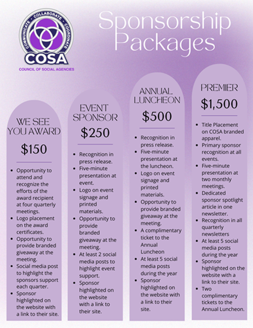 This sponsorship celebrates the unsung heroes of our community. Sponsors help shine a light on those making a difference and receive visibility among COSA’s network of nonprofit leaders and community advocates. A COSA member that has provided outstanding commitment to making the community better receives a framed certificate, a pair of purple sunglasses, and a gift card.